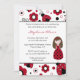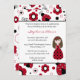 Diese 12x18 Geburtstagsfeier lädt ein ladybug Thema. Die obere und untere Grenze hat schwarze und rote Mäntel mit Blume und Punkten. Neben Ihren leicht anpassbaren Party-Informationen trägt ein Punkt ein braunes Haar.