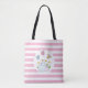 Eine Tasche mit einem Mama- und Babybunny stehend zusammen. Im Hintergrund gibt es frische Frühlingsblumen. Einige skurrile Schmetterlinge flattern darüber. Set auf einem rosa gestreiften Hintergrund.