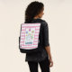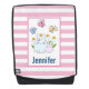 Ein personalisierter Rucksack mit rosa und weiß gestreiftem Hintergrund. Ein weißer Rahmen mit einem rosa Rahmen überlagert. Im Rahmen eine Illustration eine Mutter und ein Baby Hase stehend zusammen. Gelbe Gänge im Hintergrund. Whimsikale Schmetterlinge flattern herum.
