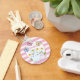 Personalisierter Schlüsselanhänger mit rosa und weiß gestreiftem Hintergrund. Ein weißer, kreisförmiger Rahmen mit einem rosa Rahmen, der oben mit Ihrem personalisierten Namen überlagert ist. Im Rahmen eine Illustration eine Mutter und ein Baby Hase stehend zusammen. Gelbe Gänge im Hintergrund. Whimsikale Schmetterlinge flattern herum.