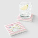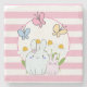 Ein Untersetzer aus Stein mit rosa und weiß gestreiftem Hintergrund. Ein weißer, kreisförmiger Rahmen mit einem rosa Rahmen, der oben platziert ist. Im Rahmen eine Illustration eine Mutter und ein Baby Hase stehend zusammen. Gelbe Gänge im Hintergrund. Whimsikale Schmetterlinge flattern herum.