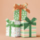 Niedliche geschlechtsneutrale Babyduschverpackungen mit Bundsen, Karotten, Federn und Streifen in den Farben Grün, Gelb und Orange. Grüne Babyduschenverpackung für eine Frühjahrs-Babydusche oder eine Osterbabydusche.