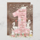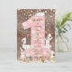 Niedliche sonnige große Mädchen Geburtstag Einladung mit einer rosa großen Nummer eins mit Blume Set auf einem rustikal braunen Hintergrund.