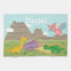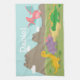 Ein niedliches und buntes Dinosaurierküchentuch. Es kommt mit Cartoondinosauriern, einem gelben Brachiosaurus, einem lila Triceratops, einem grünen Stegosaurus und einem rosa Pterodactylus. Hintergrund der Berge und der Wolken. Dieser attraktive Entwurf ist für Kinder groß, die Jura-, prähistorische oder Dinosaurierthemen der Liebe. Addieren Sie den Namen des Kindes, um ihn besonders speziell zu machen.