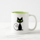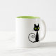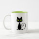 Eine hübsche Tasse zeigt eine schwarze Katze mit einem langen, lockigen Schwanz, sitzend. Diese Katze hat grüne Augen. Das Design ist auf beiden Seiten. Niedlich. Für Katzen, Kätzchen, Kätzchen, Tiere und Haustiere. Diese coole Katze hat eine Einstellung. Phantastische Art, Ihr Lieblingsgetränk zu trinken.