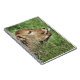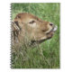 Ein schönes niedliches Kalb, das im langen Gras liegt und seine Zunge herausklebt.