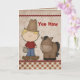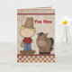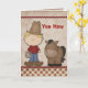 Die Geburtstagskarte eines niedlichen Jungen wurde in einem alten Papierlook mit einer Grafik des Rack und einem braunen und bräunlich kontrollierten Muster erstellt. Niedliche Cartoon-Grafiken eines kleinen Cowboy mit einem Seil und einem Pferd neben ihm schmücken die Kartenvorderseite. Benutzerdefinierter roter Text innen und außen ist vollständig anpassbar und kann für jedes kleine Buckaroo personalisiert werden.