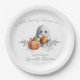 Diese Babydusche-Teller haben ein niedliches Halloween-Babythema. In der Mitte wird ein kleiner, im Häkelstil gehaltener Geist mit einem Stück Süßmais abgebildet, der neben einem Kürbis stehend ist. Unter den kleinen Stöcken befindet sich ein Babyhuhn. Die Formulierung "ein kleines Buch ist fast fällig" wird oben in einem eleganten Script-Schriftart gedruckt. Der Salbei-grüne Schriftart eignet sich für Jungen, Mädchen oder geschlechtsneutrale Babyduschen.