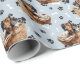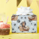Ein bezaubernder, kleiner, schwarz-bräunlicher Dackel-Welpe, der in einem Korbkorb liegt, ist das Muster dieses jeder Anlass Geschenkpapier. Das Portrait ist inmitten eines Musters aus schwarzen Pfoten und weißen Knochen, und wird auf einem silberblauen Hintergrund wiederholt. Ideal für jede Dackel Hundeliebhaber!
