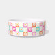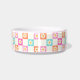 Niedlich, hübsch und farbenfroh! Diese gemusterte Hundeschüssel ist mit süßen Molkereien auf einem mehrfarbigen Chequerboard-Muster in Creme, Rosa, Orange und Türkis bedruckt.