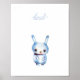 Eine blaue Farb-Bleistift-Abbildung eines bezaubernden Kaninchenbabys, gepaart mit dem Wort "freundlich" - das Sie mit einer anderen Qualität ändern können. Teil der Kollektion "Magische Waldtiere", suchen Sie nach anderen (Fuchs, Bär, Marmelade, Eule, Eichhörnchen), die Sie an den Wänden des Kinderzimmers Ihres Babys kombinieren können, um Qualitäten wie Freundlichkeit, Weisheit usw. zu veranschaulichen.