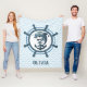 Adorable personalisierte nautische Fleecedecke mit einem niedlichen Delphin und Anker in einem Schiffrad mit einem blau-weiß Zickzack Muster-Hintergrund,