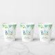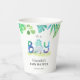 Es ist ein Boy Dinosaurier Thema Baby Dusche Papier Becher! Das Design besticht durch einen bezaubernden, wasserfarbenen, kleinen Dinosaurier, der aus einem Ei geschlüpft ist, farbenfrohe Typografie, Blätter aus Palmen und andere botanische Pflanzen.