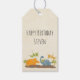 Herzlichen Glückwunsch zum Geburtstag Geschenktags-Tags mit einem niedlichen Design mit 4 Dinosauriern. 2 fliegen und 2 sind auf dem Boden. Erschaffen mit Aquarellen.