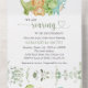 Mit dieser charmanten Babydusche laden Sie Freunde und Familie in Stil und Set zu einem erlebnisreichen Tag ein. Das Design umfasst Dinosaurier (Brontosaurus, Triceratops, Tyrannosaurus rex) und Grünpflanzen auf weißem Hintergrund.