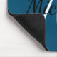 Mauspad mit einfachem, tiefblauem Hintergrund und einem minimalen Schwarzweiß-Monogramm, das zuerst und zuerst benannt wurde