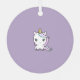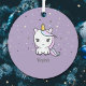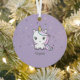 Ein Lila Weihnachtsschmuck mit einem niedlichen Einhorn in Pastellfarbe, einem anpassbaren Vornamen, einem Polka-Punkthintergrund und einem weiteren Einhorn auf der Rückseite. Ideal für Ihre Weihnachtsdekoration!