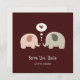 Verkünden Sie Ihre Verlobung / Hochzeit auf unkonventionelle Weise mit dieser niedlichen Save the Date Karte mit Elefanten in Liebe Cartoon Illustration. Personalisieren Sie es mit Ihren eigenen Informationen oder passen Sie es weiter an, wenn Sie die Farben, den Text oder die Einladungsgröße ändern möchten.