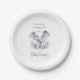 Personalisierte Baby Dusche Teller mit einem süßen Babyelefant, umgeben von zarten Blumen im Aquarellstil. Koordination von Einladungen und Servietten.