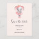 Save the Date Postkarte mit einer hübschen Abbildung. Ein grauer Elefant mit einem rosa Tutu und Blume tanzen Ballett, en pointe.