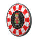 Moderne Elf, die eine Geschenkboxen und Goldkonfetti auf dem schwarz-weiß-schwarzen Dart Board halten. Text kann personalisiert sein. Ideal für Familienspass!