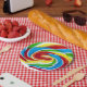 Niedliche Farbige Sweet Candy Rainbow Lollipop Papier Teller. Perfekt für die Geburtstagsparty eines süßen Mädchens