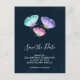 Save the Date Postkarte mit einem zarten Naturdesign. 3 Schmetterlinge in Aquarellfarbe, rosa, lila und grün gestrichen. Dunkelblauer Aquarellhintergrund.