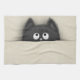 Niedliche flaumige schwarze Katze, die heraus Geschirrtuch