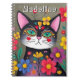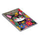 Personalisiertes Notebook mit einer Abbildung einer schwarz-weißen Katze, umgeben von bunten rosa, gelben, lila und blauen Blumen.