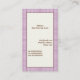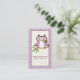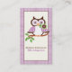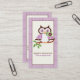 Niedliche Frühlingsohle auf einer Zweigstelle mit lila karierten GrenzVisitenkarten, mit einer niedlichen Frühlingsheule in lila-dunkelbraun, die eine Blume in ihrem Schnabel (Rechnung) auf einem Zweig mit grünen Blätter an lila kariert Grenze hält. Ein bezauberndes, feminines, dekoratives Design für Eukalyptusliebhaber. Kunstwerk von Trina Clark.
