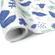 Modernes, blumengeschmücktes Papier in Ochsenblau und Minzgrün mit beigen Akzenten, das einen Frühlingsgarten mit Tulpen und Birdies darstellt.