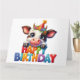 Herzlichen Glückwunsch zur Geburtstagskarte. Niedliche, bezaubernde Kuh mit einem Hut aus Party. Eine bezaubernde Kindergeburtenkarte. Diese Karte ist leer für Ihre eigene Nachricht. Auch als digitaler Download für den Transfer zu anderen Produkten verfügbar.
