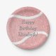 Diese niedlichen Tennis-Geburtstagsparty-Teller verfügen über eine minimalistische Tennisball-Grafik (die nur durch die weißen Nähte der Tennisball repräsentiert wird) mit einer schicken, rosa, digital kreierten Textur, auf der Sie den Text in beliebiger Farbe anpassen können - durch katz_d_zynes