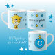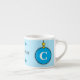 Tasse "Espresso size" für Kinder. Auf dieser Tasse gibt es eine niedliche Giraffe mit Sternen. Fügen Sie einen Namen und einen Initial hinzu. Blau und Gelb.