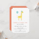 Niedliche Giraffe, Einladung zur Geburtstagsfeier. Giraffe mit Party Hut und blauer Ballon, kontrastierender orangefarbener Text und Hintergrundfarbe.