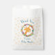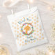 Vielen Dank für Ihr Interesse an Taschen zum Duschen oder Geburtstag. Entworfen mit einer Illustration eines niedlich lächelnden Giraffengesichts, umgeben von einem Kranz tropischer Aquarellfarben-Blume. Farbenfroh und niedlich. Hintergrund ist ein verblasstes Muster mit orangefarbenen Knorpelflecken.