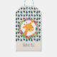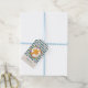 Vielen Dank Geschenketiketten mit einer Illustration eines niedlich lächelnden Giraffengesichts, umgeben von einem Kranz tropischer Aquarellfarben-Blume. Farbenfroh und niedlich. Hintergrund ist ein Muster mit blauen kindischen Dreiecken.