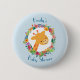 Ein Button-Backbutton-Abzeichen für eine Babydusche mit einer Illustration einer niedlich lächelnden Giraffe, umgeben von einem Kranz tropischer Aquarellfarben-Blume. Farbenfroh und niedlich.