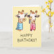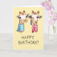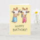 Handgezeichnet Grußkarte mit einem Bild von zwei Giraffen vom Hals bis hin zu weißen Fellen und braunen Splotch-Markierungen, mit Schals (blauer Schal auf verlassen Giraffe und rosa Schal auf rechter Giraffe) und einer Giraffe, die die Zunge herausklebt. "Happy Birthday!", handgeschrieben in Hauptstadt Buchstaben unten.