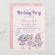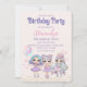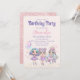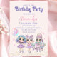 Diese niedliche Geburtstag-Party Einladung bietet ein Glitzer-Mode-Puppenthema. Drei Puppen mit farbenfrohen Haaren und niedlichen Outfits sind unten platziert. Eine Puppe hält Ballons und rosa Sterne sind um sie herum platziert. Die Sterne des Gold Glitzer werden unten platziert.