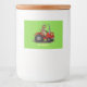 Niedliche glückliche Kuh, die einen roten Traktor- Lebensmitteletikett