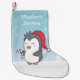 Ein niedlicher Strumpf für das wenig eine, zum der wenigen Weihnachtsgeschenke anzufüllen. Es hat einen Cartoon eines niedlichen und glücklichen Penguin, der an zu einer Zuckerstange hält und eine Weihnachtskappe trägt. Ein schöner Schneehintergrund mit Kiefern. Setzen Sie ein Lächeln auf Ihr kleines irgendjemandes Gesicht mit diesem herrlichen Entwurf. Personifizieren Sie mit dem Namen des Kindes.
