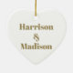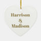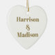 Niedliche, goldfarbene und weiße, kundenspezifische Namen von Ehepaaren, moderne elegante Keramik Ornament des Herzens. Erhältlich in vielen Formen und Materialien. Benutzerdefinierte Imitate Gold Text Typografie, weißer Hintergrund. Großer Valentinstag, Jubiläum, Freund, Freundin, Freunde, Weihnachts-Sake-Geschenk. Karo der Erholung der Auflistung für die Abstimmung der Elemente.