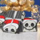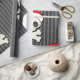 Niedliches Verpackungspapier, mit Schwarzweiss-Hintergrund und Muster der Schädel in den roten Weihnachtsmannmützen.