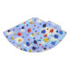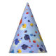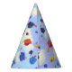 Diese Abiturenhüte sind mit einer Szene von farbenfrohen Graduierungskappen dekoriert, die in die Luft geworfen werden und an einem blauen Himmel mit puffigen Wolken gezeigt werden.