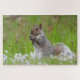 Adorable graue Eichhörnchen stehend in einem grasbewachsenen Bluetts-Feld, das eine Nuss frisst