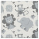 Die gemusterte Stoffkonstruktion zeichnet sich durch eine Monogramm-Initial- und Muster von Baby Dschungeltierfreunden aus - einem Vogel, Affen, Elefanten und Löwen. Dieses moderne und süße Safari-Thema Stoff hat ein Farbschema von Baby in Grautönen.