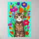Niedliche Volkskunst Stil niedlich grüne mit Augen graue Katze. Diese Kunst ist KI generiert. Hübsche, blaue, lila und rote Blume mit aquamarinem Hintergrund. Generativität