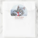 Weihnachtsaufkleber mit einem niedlichen Weihnachtsfoto einer grauen Tischkatze, die spielerisch eine rote Weihnachtsmannmütze beißt. Seine großen, flauschigen Pfoten machen dieses Foto besonders reizvoll.