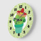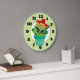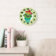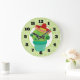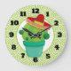Eine Uhr mit einer niedlichen Illustration eines grünen Kakteen, das in einem Blume-Topf sitzt. Große kawaii Augen und mit einem roten Sombrero. Der Hintergrund ist ein Muster mit grünen Wirbel.